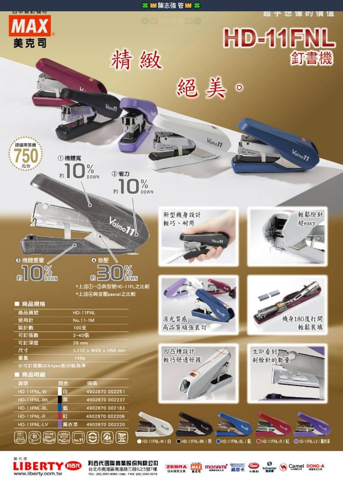 ◆創新的省力結構,能減少約10%的按壓力道,輕鬆裝 訂2至40張紙