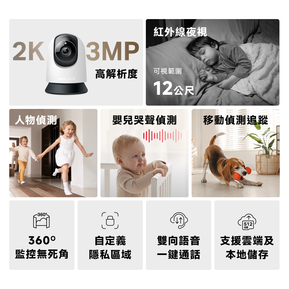 ◆高畫質影像 - 具有 2K 3MP 高畫質影像,提供清晰且細緻的影像。◆旋轉鏡頭 - 提供 360° 水平旋轉功能,實現全方位區域覆蓋。◆夜視功能 - 採用的進階夜視技術最遠可達 12 公尺◆雙向語音 - 透過內建麥克風與揚聲器來即時聆聽並回覆