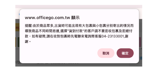 確認訂購後會跳出提醒資訊/確定後完成訂單