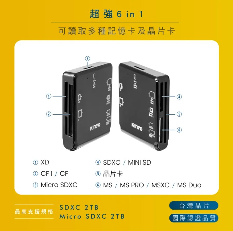 ◆超強多合一功能,可讀取數種記憶卡、晶片卡◆6插槽,專為各種卡量身設計◆支援最高容量高規格SDXC 2TB