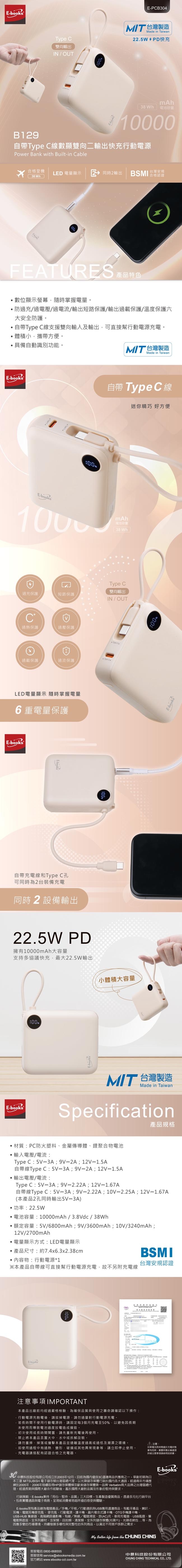 E-books 台灣製造B129 自帶Type C線數顯雙向二輸出快充行動電源